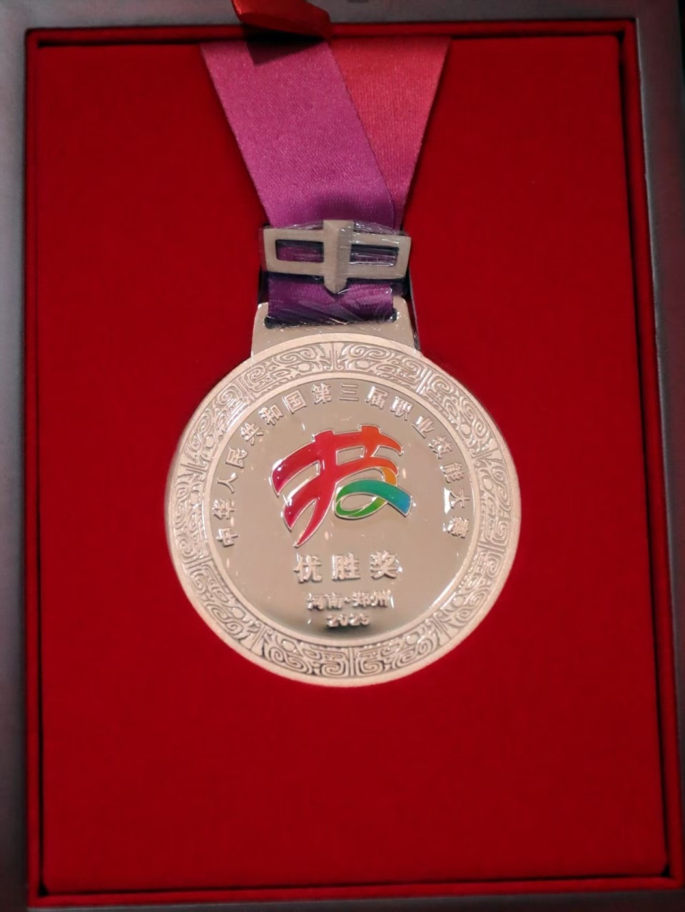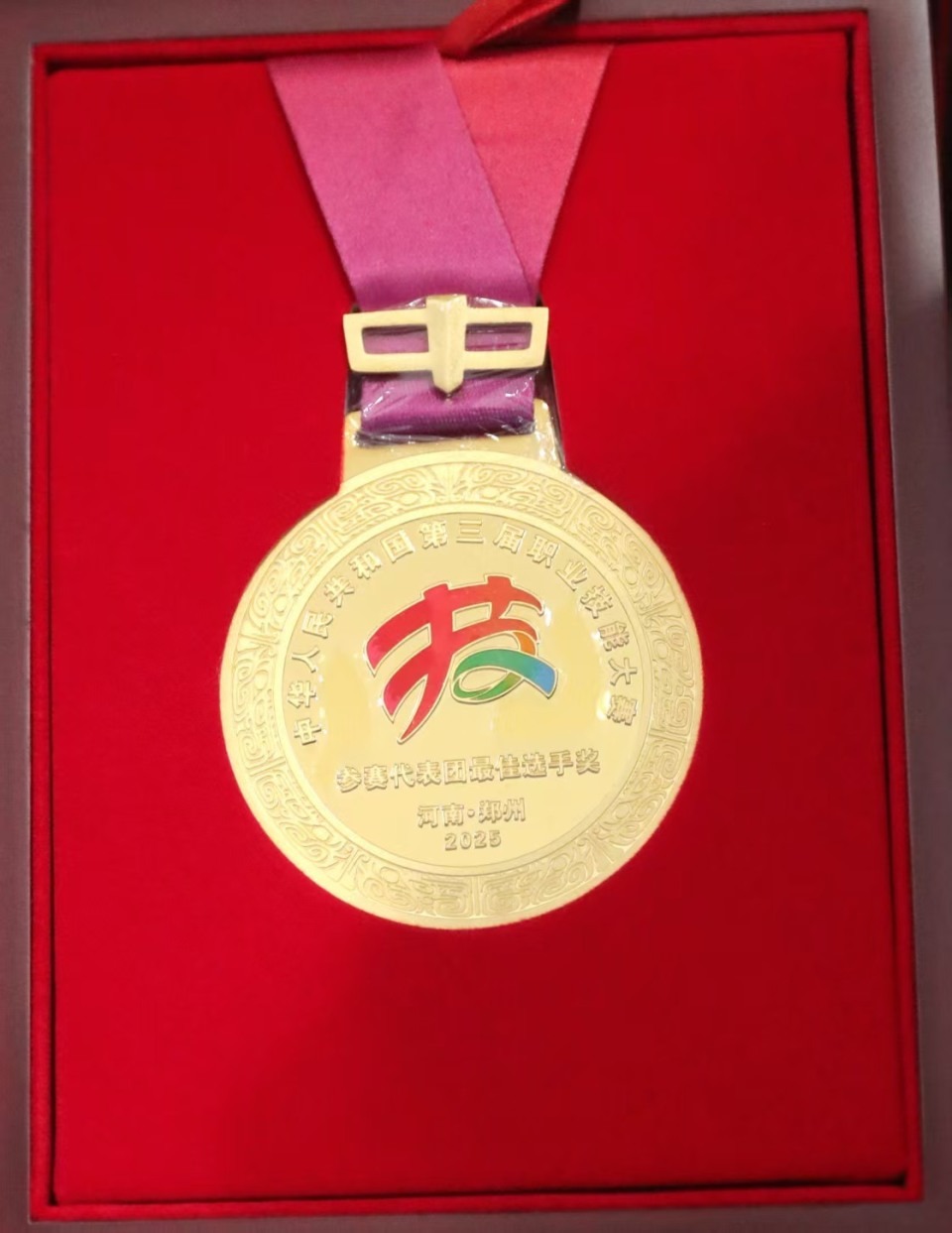大河报·豫视频记者从发布会上了解到,此次大赛奖牌设计方案,围绕“中”字突出河南特色元素,奖牌正面环绕“中华人民共和国第三届职业技能大赛”中英文名称,中央突显大赛标识,底部融入大象图案;背面融合黄河、二七纪念塔、高铁三大元素,既展现主办地河南的历史底蕴,又体现创新精神。挂梁处将“中”字与饕餮纹相融,饕餮纹展示河南的历史文化积淀,“中”字突出河南的地理区位优势,具有鲜明的地域特色和文化特征。