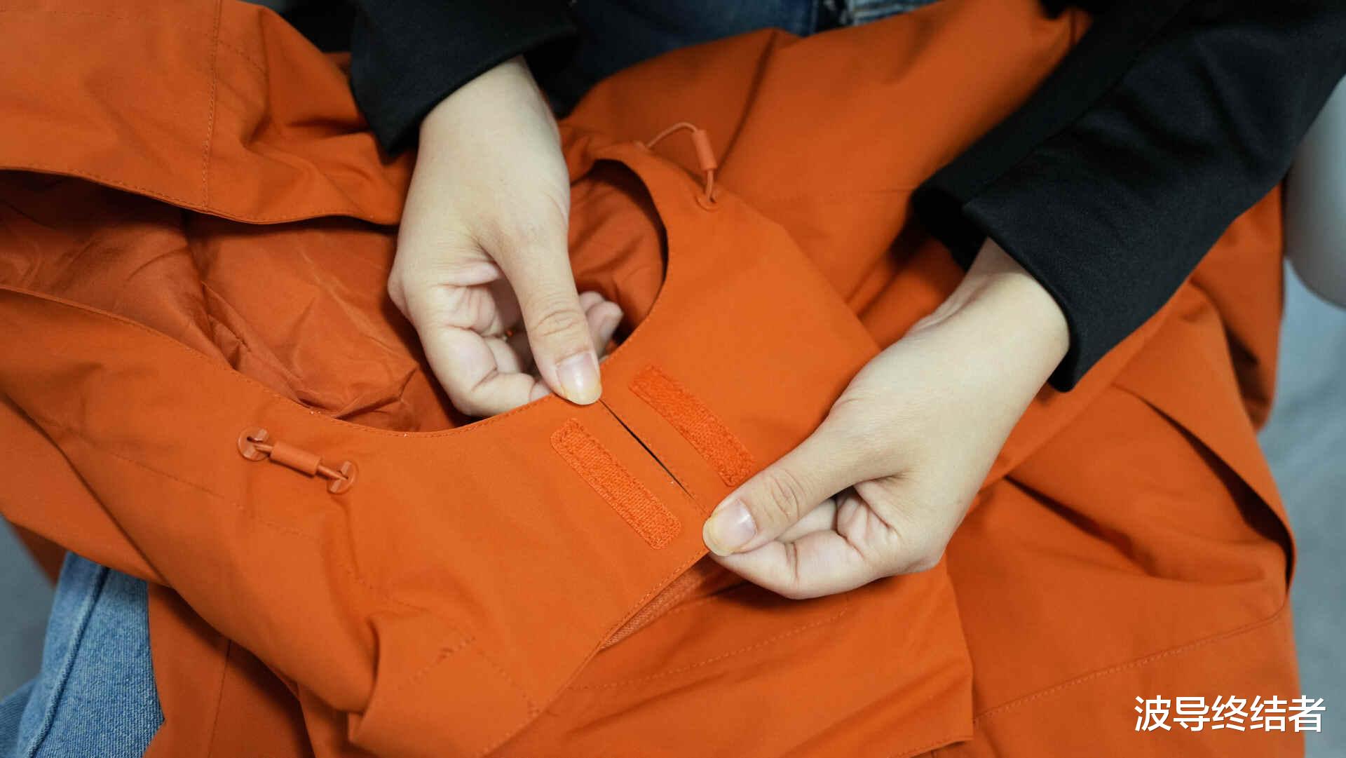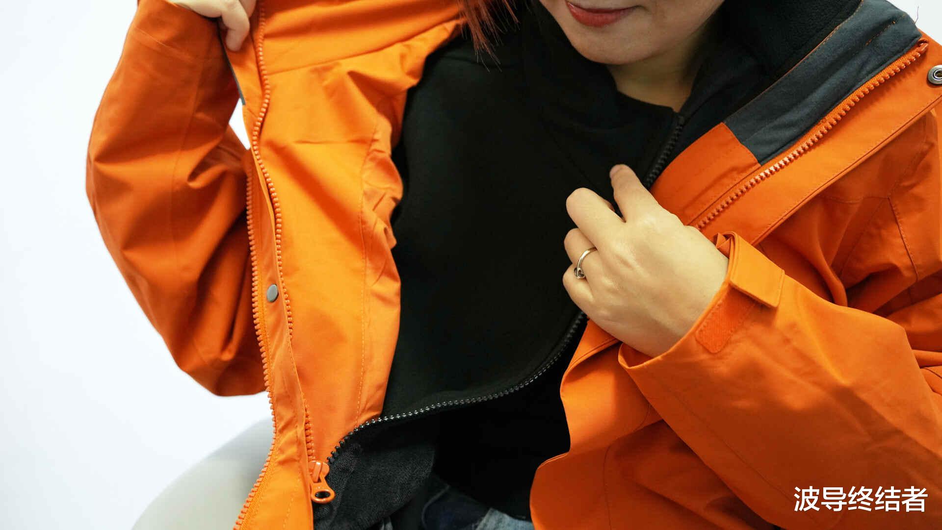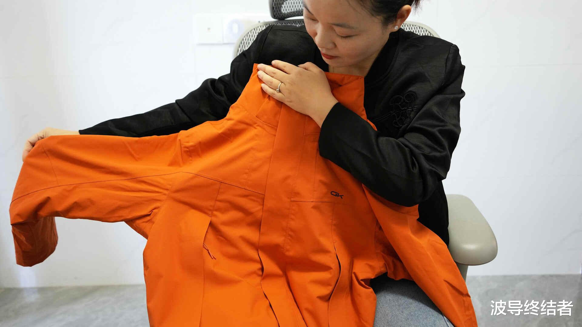 女生穿的,所以在黑灰橙三色当中,当然是选了亮色的橙款。这款冲锋衣号称防风,防水,防寒,防磨损,防划,防油污,防静电的七防,搭配上硬核STOPS-X七防无氟科技面料、SOPE-AIR超强防水防磨损涂层黑科技,35000mm暴雨级防水指数+30000g/m²透湿率和超常规5年性能抗衰减认证。等下马上就来看看实际效果。