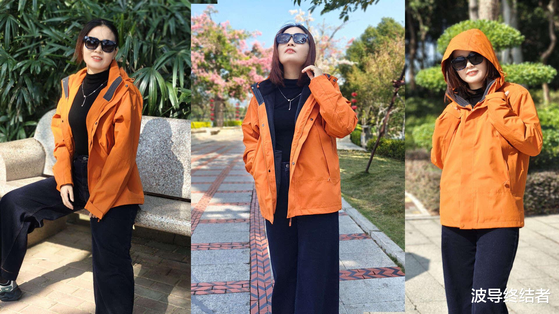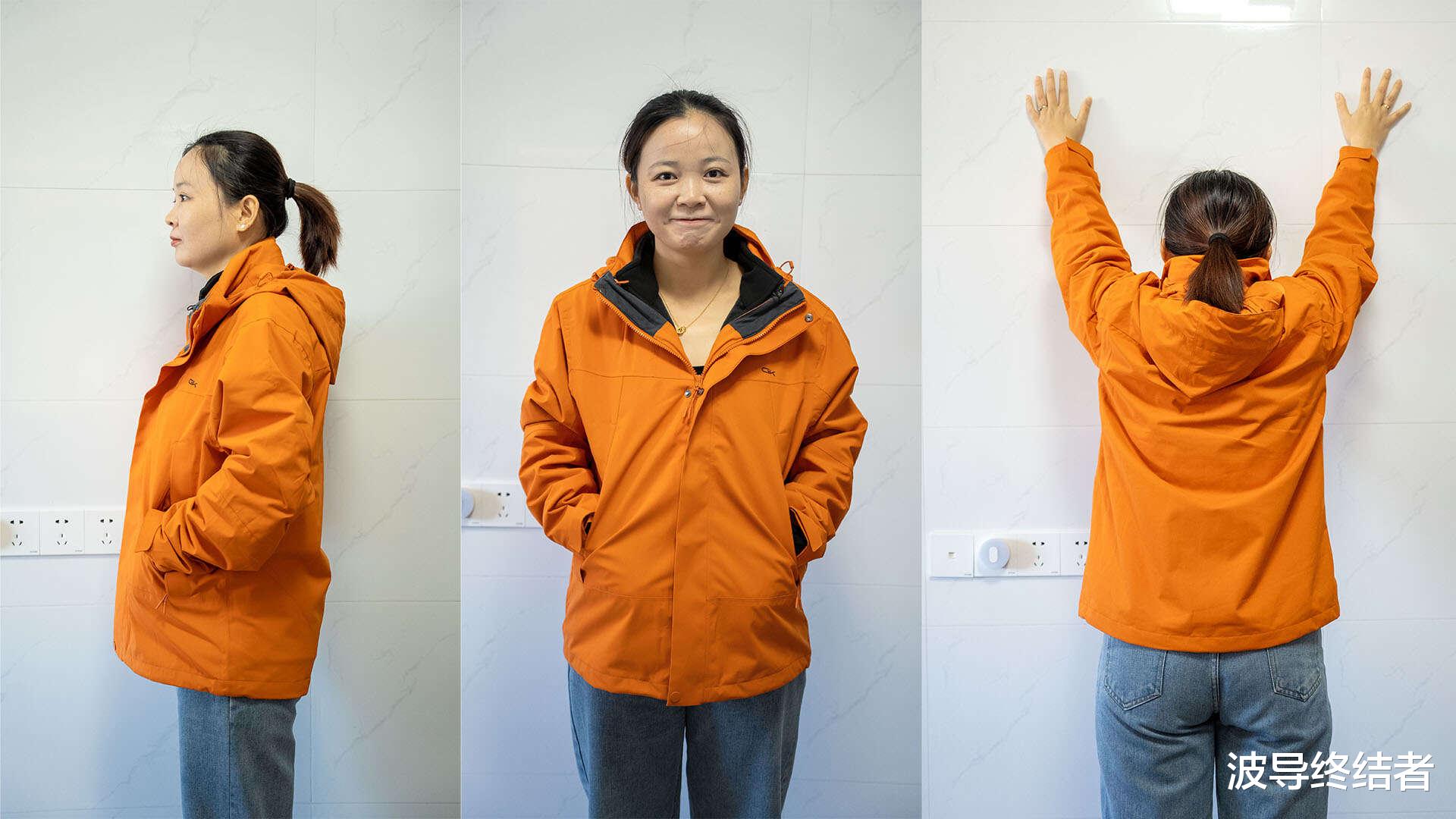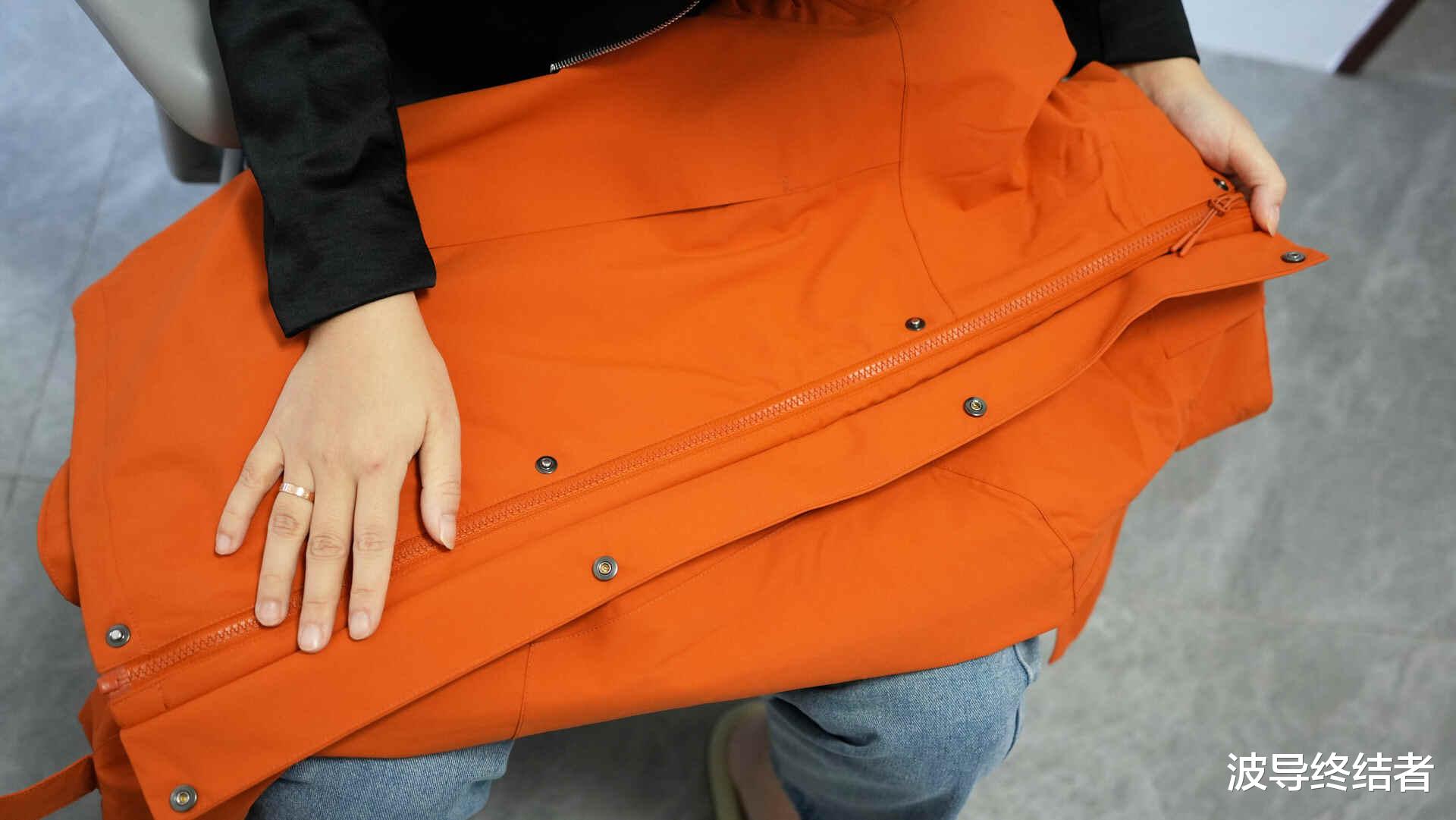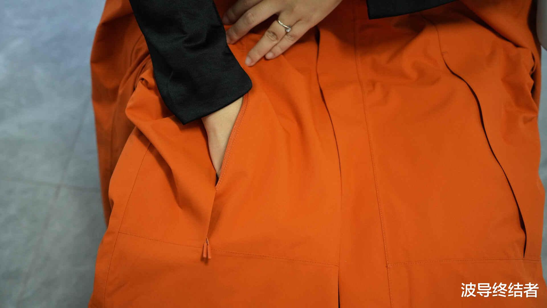 女生穿的,所以在黑灰橙三色当中,当然是选了亮色的橙款。这款冲锋衣号称防风,防水,防寒,防磨损,防划,防油污,防静电的七防,搭配上硬核STOPS-X七防无氟科技面料、SOPE-AIR超强防水防磨损涂层黑科技,35000mm暴雨级防水指数+30000g/m²透湿率和超常规5年性能抗衰减认证。等下马上就来看看实际效果。