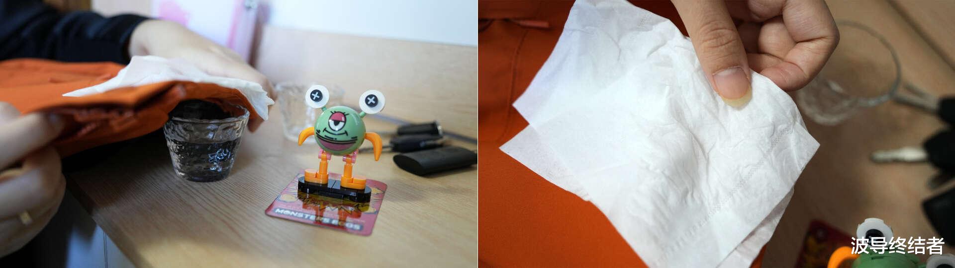 一般的材料,如果保暖抗风,也经常意味着透湿性能不好,穿身上就是闷汗。那这种冲锋衣能解决这个问题吗?我拿一杯热水试了试,湿气可以较快地透过面料散发出去,没一会儿盖上面的纸巾就吸到了不少湿气。 它用了AMES生物微孔黑科技、微张散热传导生物膜,还有内里的高压透气透湿涂层工艺等,这些都让冲锋衣在高强度运动排汗时表现得很出色。
