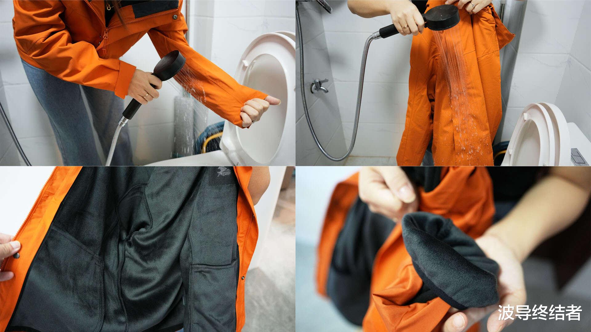 第二项很重要的就是防水性能了,在外头下点雨什么的可是太常见了。GaKior这款户外冲锋衣标称了全缝隙EP无渗透双层压胶和高压冲胶工艺处理,八层防水设计,这个咱也很难弄清楚细节,还是来看实测。直接用水冲,然后看一下内里有没有湿。这玩艺的防水性能有点超出我的预期,里面滴水不透是真厉害,不知道他们有没有打算做雨衣……