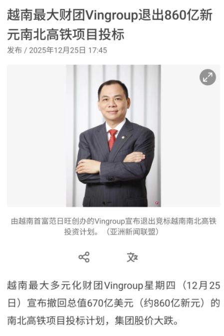 去年12月底,预计总投资670多亿美元的越南南北高铁项目黄了,越南最大的房地产公司和最大财团Vingroup半途而废,哪怕股价暴跌也不接盘这个越南史上最大的基建项目。