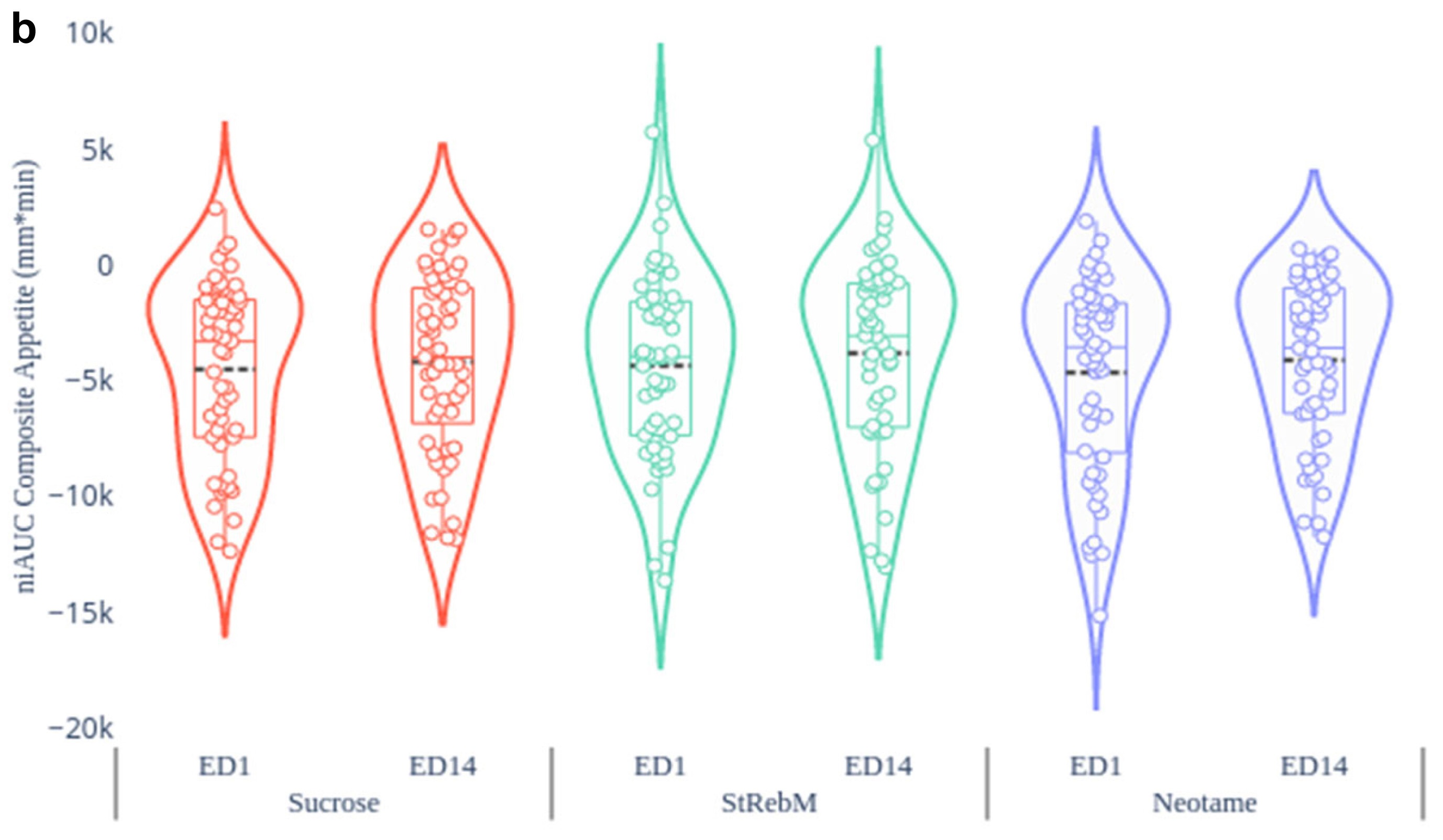 该研究招募了53名年龄在年龄在18至60岁之间健康的超重/肥胖成人,进行了一项随机交叉试验。参与者在三个为期2周的干预期期间,分别每天食用含有蔗糖、纽甜或甜菊糖苷Reb-M水果馅的饼干。