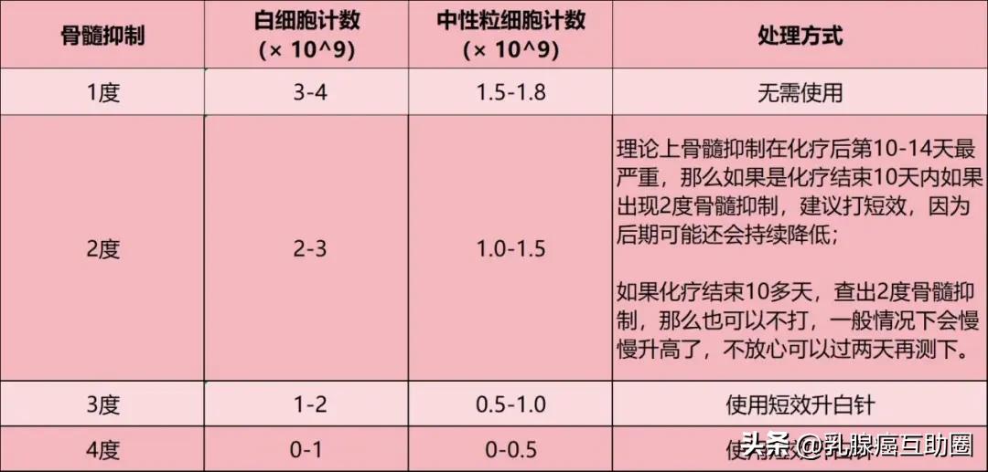 当白细胞总数低于4.0 × 10^9 / L时,一般就建议用上升白针和升白药物。骨髓抑制分为1度、2度、3度和4度。