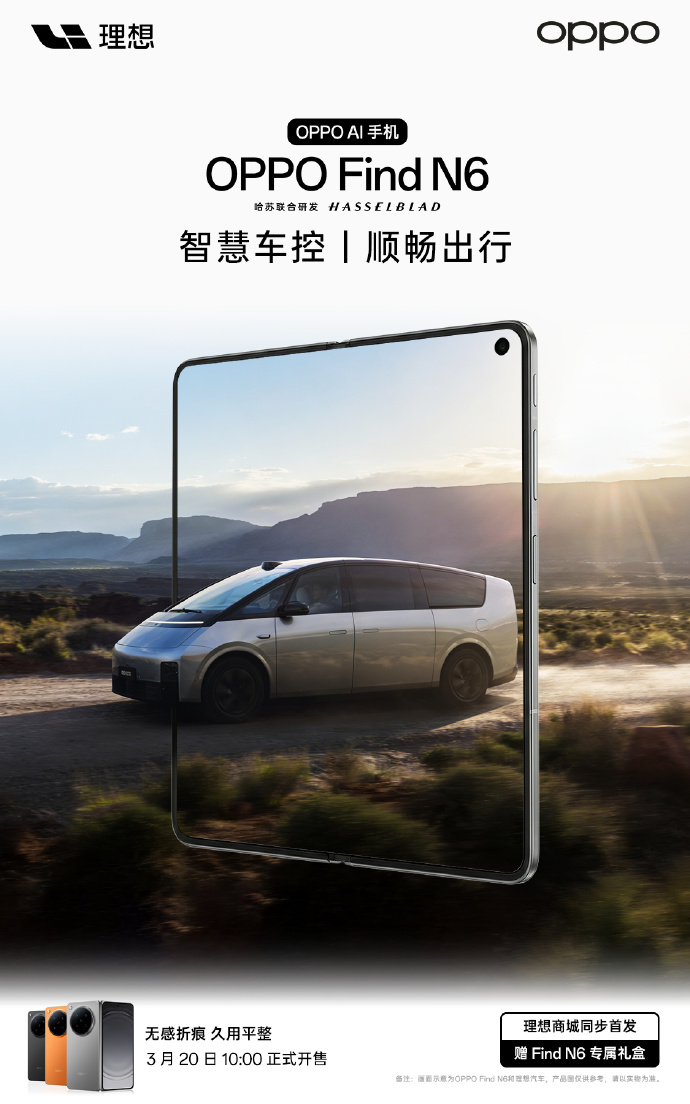 抢不到的话,可以试试理想商城,居然也上架了!可以3月20号试试运气。理想车主抢到了还可以用手车互联,并且除了理想,OPPO Find N6还联合比亚迪、智己、红旗、长城等等多家车企打造手车互联,地址信息在手机上一拖就能同步到车机,这个是真的蛮实用的。