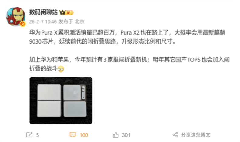 从行业趋势看,阔折叠屏凭借更适合阅读、办公和多任务处理的屏幕比例,正在成为高端折叠屏的主流方向。据苹果供应链消息,富士康已在试产苹果首款折叠屏手机iPhone Fold,预计2026年下半年问世,采用了与华为类似的阔折叠方案。