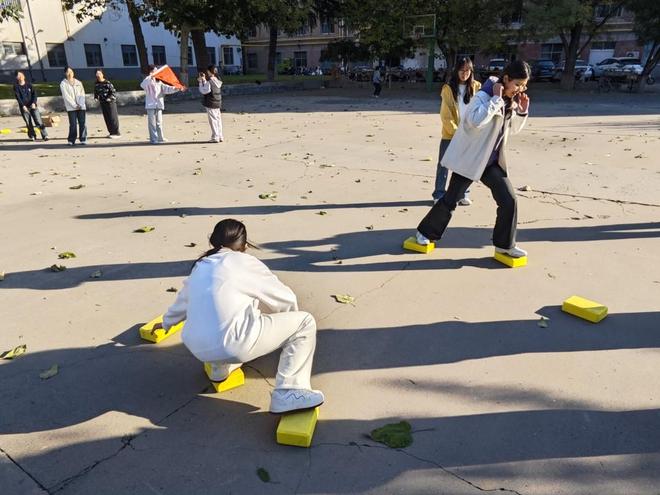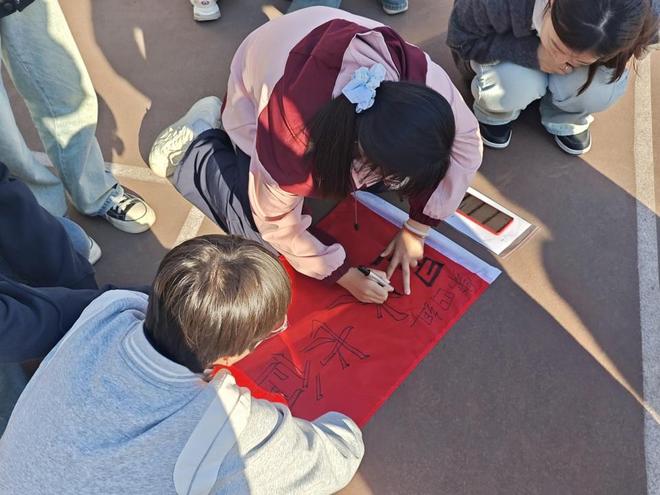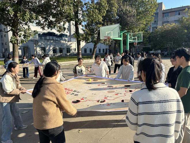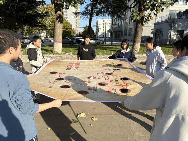 在室外环节中,“重走长征路”沉浸式团队挑战赛在操场火热开赛。来自各班级的10支队伍化身“红军战士”,依次闯关“湘江突围”“遵义转折”“四渡赤水”“飞夺泸定桥”“雪山草地”五大历史场景,最终在“陕北会师”终点胜利集结。各任务点紧扣历史情境设计互动挑战,让同学们在协作闯关的过程中,真切体会到长征路上的艰辛与不易。经过近两小时角逐,所有队伍均成功抵达终点,收集的印章拼成了完整的长征路线图,全体队员挥舞队旗齐声高呼“我们胜利了”,定格难忘瞬间。