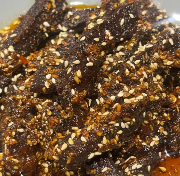 湖南的冬天,湿冷是往骨头缝里钻的。这样的天气里,人们总想吃点什么来对抗那股子阴寒。街头巷尾的卤味摊前,常常围着哈着白气等候的人,而那其中最抢手的,往往是一盘色泽红亮、裹满了辣椒籽的香辣牛肉干。它不像超市里卖的袋装肉干那样干硬,也不像广式牛肉干那样甜软,它有自己的脾性——肉质紧实却还能撕出细腻的肉丝,每一根纤维里都吸足了自家调的酱汁,入口先是咸香,而后是绵长的辣意,最后留下一丝回甘,勾着你忍不住再去拿下一块。