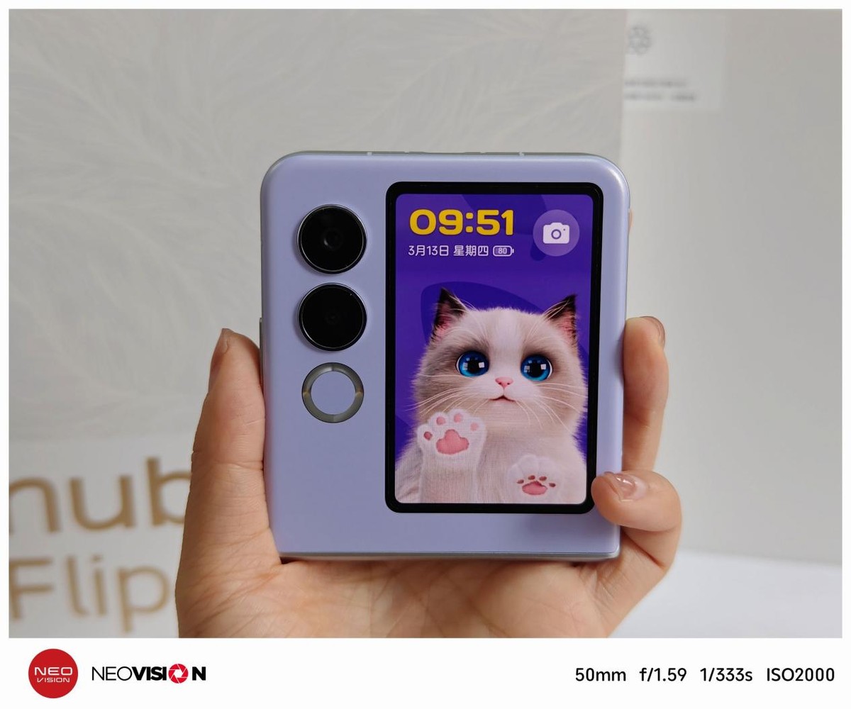 芯片方面,努比亚Flip2为价格选择天玑7300X,4nm工艺,性能接近骁龙7Gen2S,属于是中端芯片。内屏6.9英寸+3英寸竖向的OLED外屏,整机重193g,展开7.2mm。然后50MP(f/1.59光圈)的主摄,悬停拍摄、手持DV模式、AI闪电抓拍也都有。要说尝鲜折叠屏的体验,什么内外屏把玩,折叠起来的颜值,vlog的创作,似乎努比亚Flip2的确有说法。