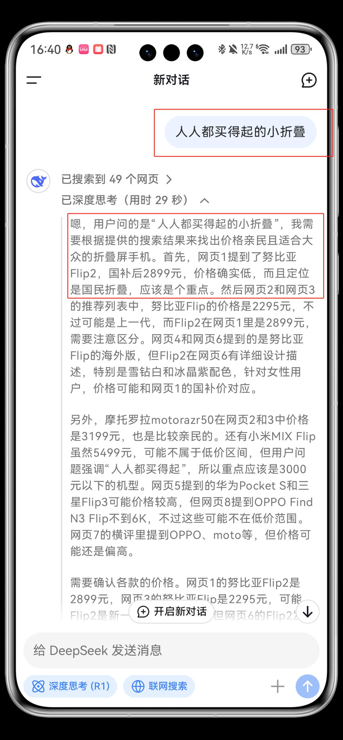 并且有网友发现大火的DeepSeek也对此有了回应,当询问DeepSeek(联网版)“人人买得起的小折叠”时,DeepSeek思考一番后,给出努比亚Flip2是综合来看的典型代表,因为其具备“超高的性价比”。