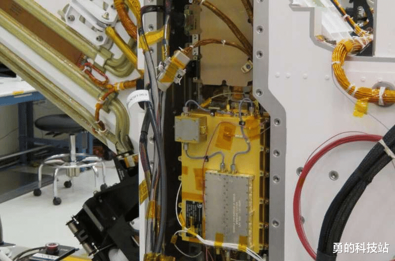 火星全球定位算法运行在直升机基站的快速商用处理器上——该上方的金色盒子被集成在NASA的“毅力号”探测车无尘室中。毅力号利用基站与现已退役的“机智”火星直升机通信。图片来源:NASA/喷气推进实验室-加州理工学院