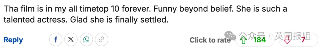“这部电影是我最爱的TOP10之一,难以置信的好笑。她是位才华横溢的演员。她很好地成长了,令人欣慰。”