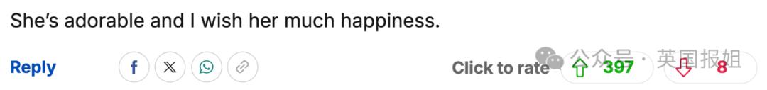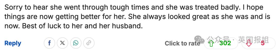 “听到她经历的困难和没被善待让我很难过。我希望她现在的情况变好了。她以前和现在都很漂亮。祝她和丈夫好运。”