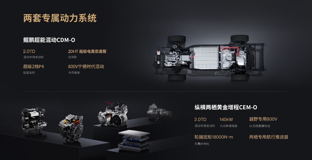 作为电混越野车,全新开发的鲲鹏超能混动CDM-O系统无疑是这台纵横G700的核心价值。