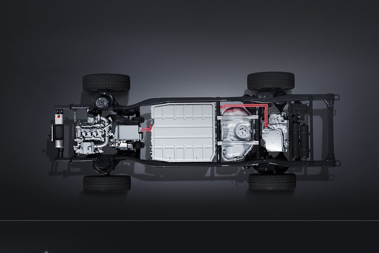 虽然都是前后解耦的电四驱架构,但有别于常见的电混SUV,这种硬派越野产品的前桥部分都采用前纵置布局,即,从车头看发动机和DHT单元都是竖着摆放。这种做法既能优化前后桥的配重,同时,也能为复杂的高强度悬架系统腾出足够的横向空间。