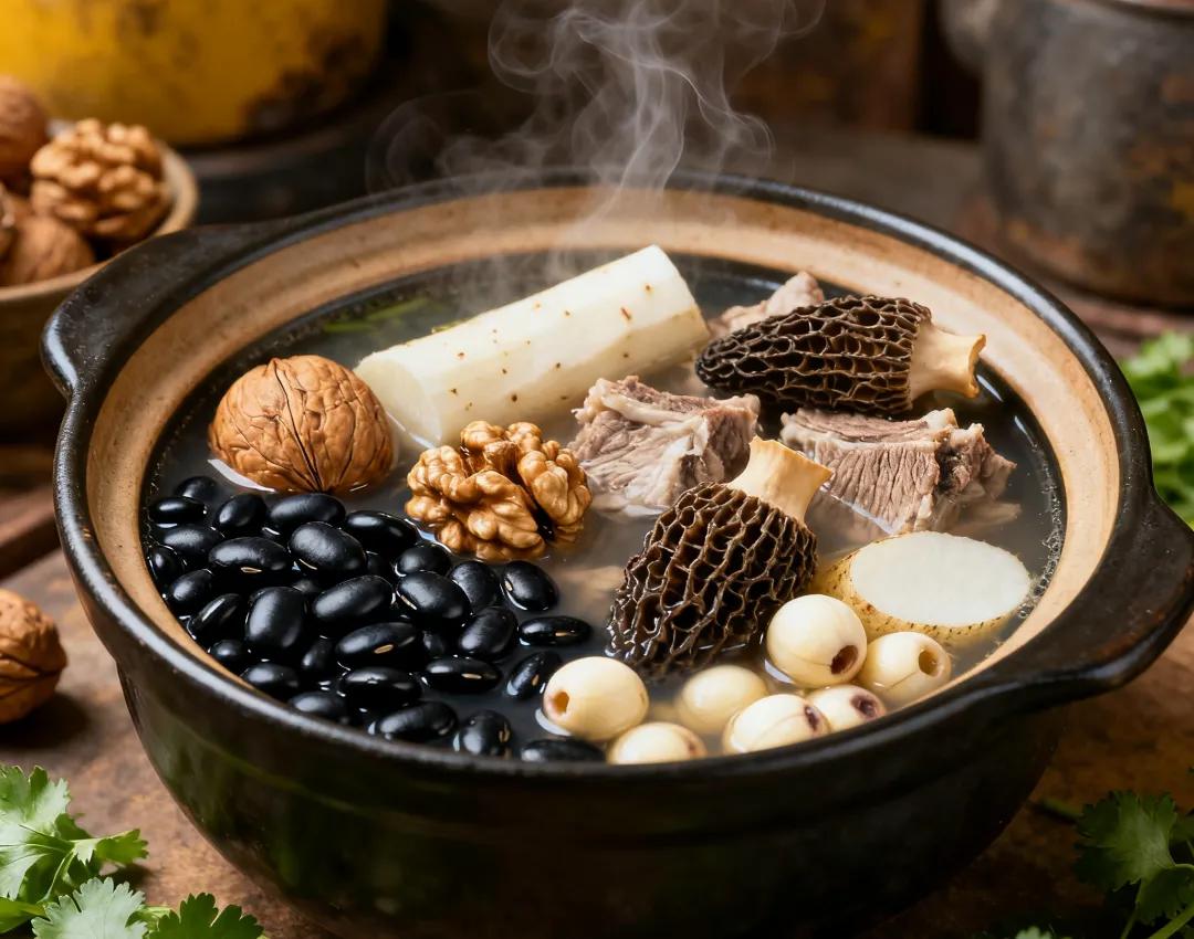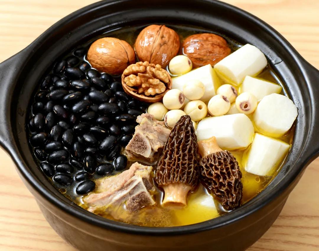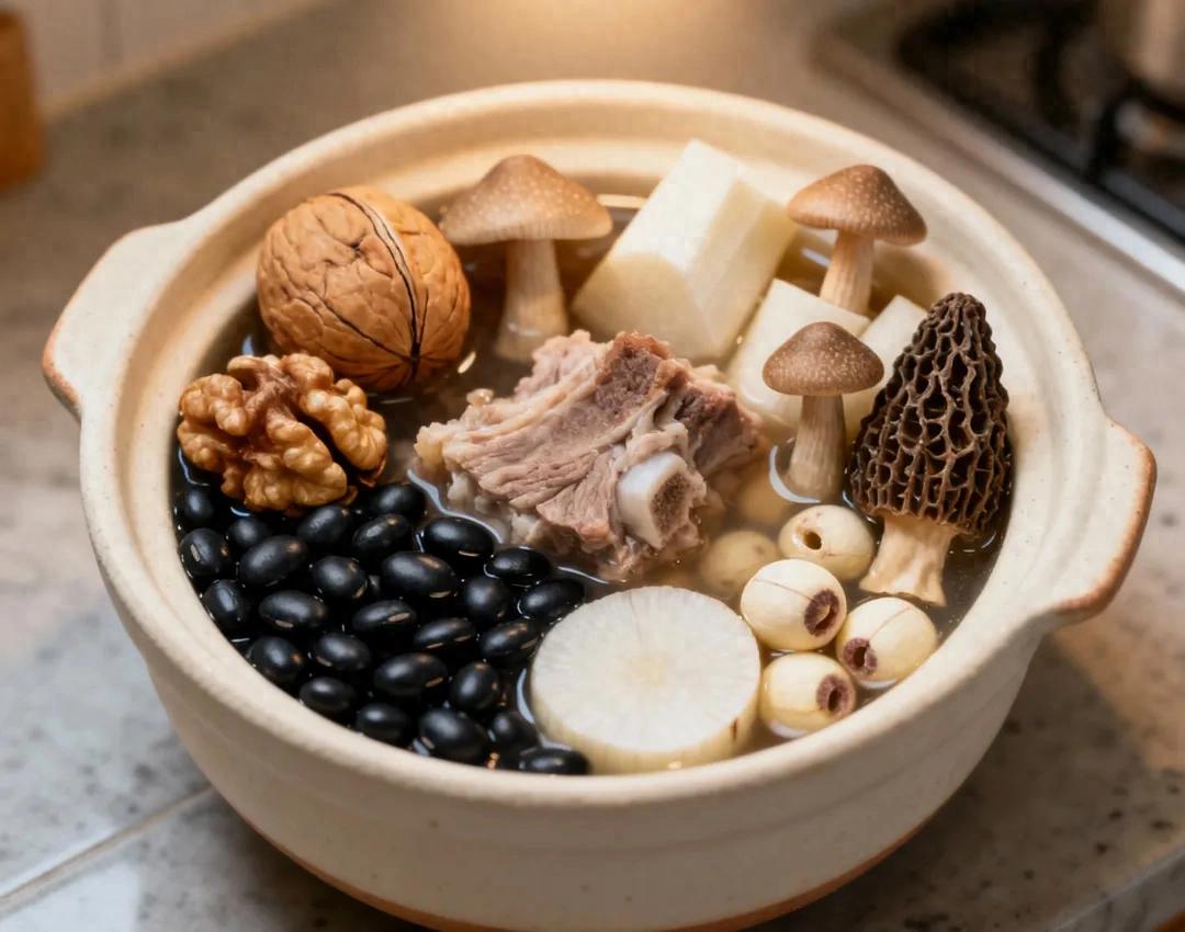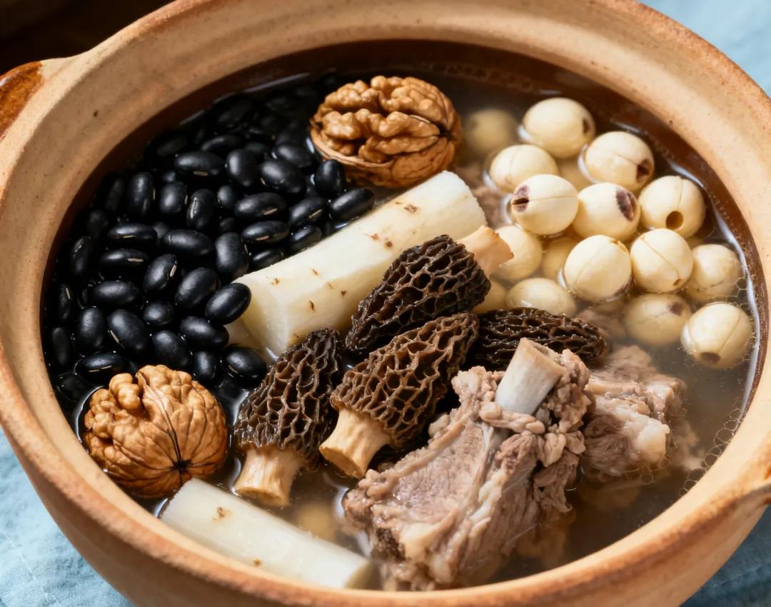 黑豆、核桃、山药、莲子、羊肚菌搭配排骨,兼顾补气养血与益肾健脾。