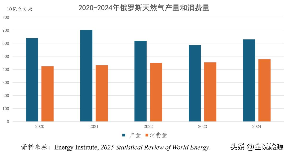 与石油类似的是,俄罗斯也是世界第二大天然气生产和出口国。根据2025年版的《世界能源统计评论》,2024年,俄罗斯的天然气产量为6299亿立方米,仅次于美国的10330亿立方米;当年俄罗斯的天然气出口量为1525亿立方米,仅次于美国的2062亿立方米。