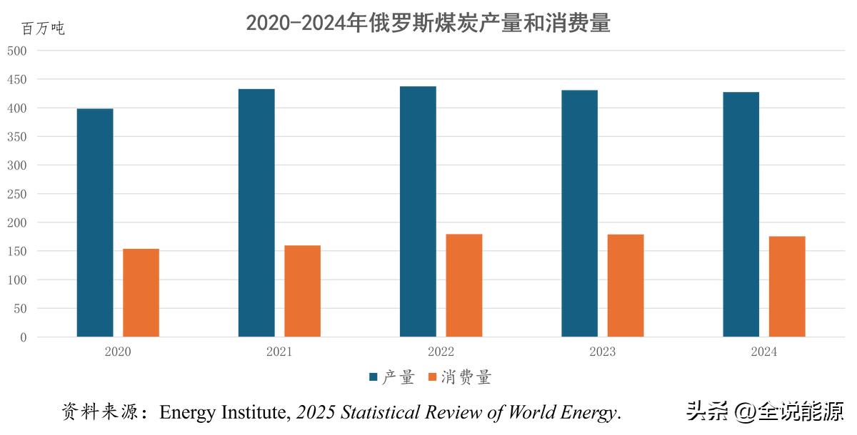 与石油和天然气相比,俄罗斯煤炭的地位和影响力虽略有逊色但也非常重要。根据2025年版的《世界能源统计评论》,2024年,俄罗斯煤炭的产量为4.272亿吨,排名中国、印度、印度尼西亚、美国和澳大利亚之后,位居世界第六;当年俄罗斯出口了2.253亿吨的煤炭,排名印度尼西亚、澳大利亚之后,位居世界第三。