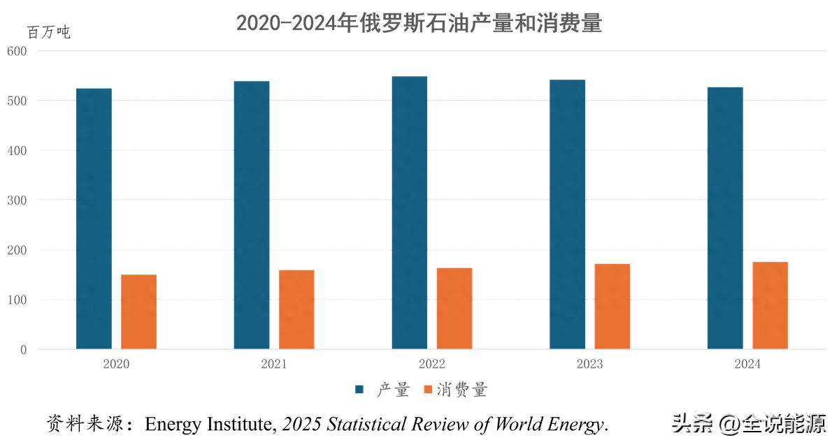 2024年,俄罗斯液体燃料,即一般意义上的石油总产量为1050万桶/天,比2023年的1090万桶/天减少了3%。当年,俄罗斯每天消耗了390万桶的石油和其他液体燃料,与2023年基本保持一致。