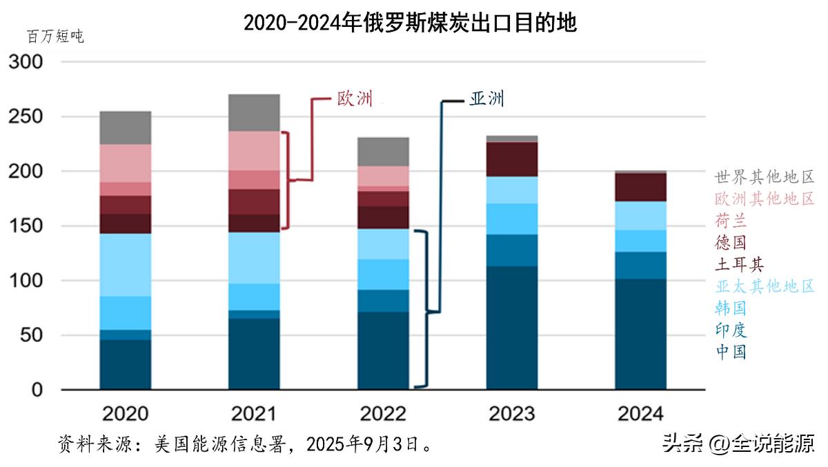 俄罗斯通过增加对亚洲(主要是中国、印度和韩国)的煤炭出口,来抵消对欧洲市场煤炭出口数量的减少。自2020年以来,中国一直是俄罗斯煤炭出口的主要接受国。2024年,中国获得了俄罗斯煤炭出口的49%,高于2023年的47%和2022年的22%。2023年至2024年,尽管中国从俄罗斯进口的煤炭总量同比下降13%,但俄罗斯仍是中国仅次于印度尼西亚的第二大煤炭供应国。