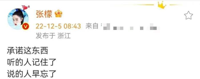 张檬配文称“承诺这东西,听的人记住了,说的人早就忘记了”,言语中透露出些许的无奈之情。