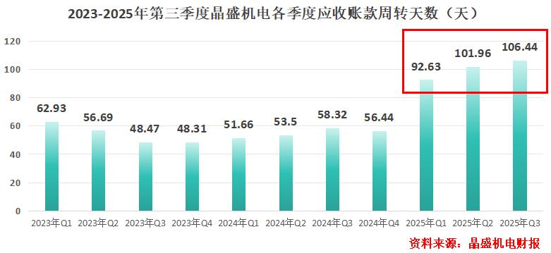 从数据上,我们也能感受到晶盛机电的压力。2023-2025年第三季度,公司应收账款周转天数突破了100天,反映出客户回款意愿和能力的弱化。