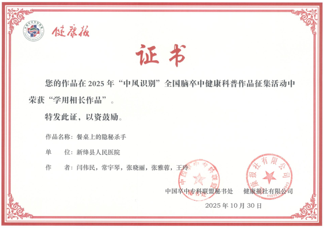 11月9日,在2025年中国脑卒中大会中风识别行动颁奖仪式上,新绛县人民医院卒中中心制作的科普视频《餐桌上的隐秘杀手》荣获国家级“学用相长奖”。