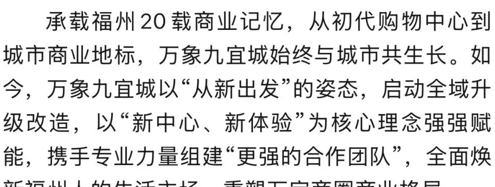 商管代运营团队撤出万象九宜城,福州城市观察者#说商道市首发的这一消息引发极大关注与热议。似是回应,万象九宜城4月2日官宣证实,“携手专业力量组建‘更强的合作团队’,全面焕新福州人的生活主场,重塑万宝商圈商业格局。”(注:当前显示“该内容已被发布者删除”)