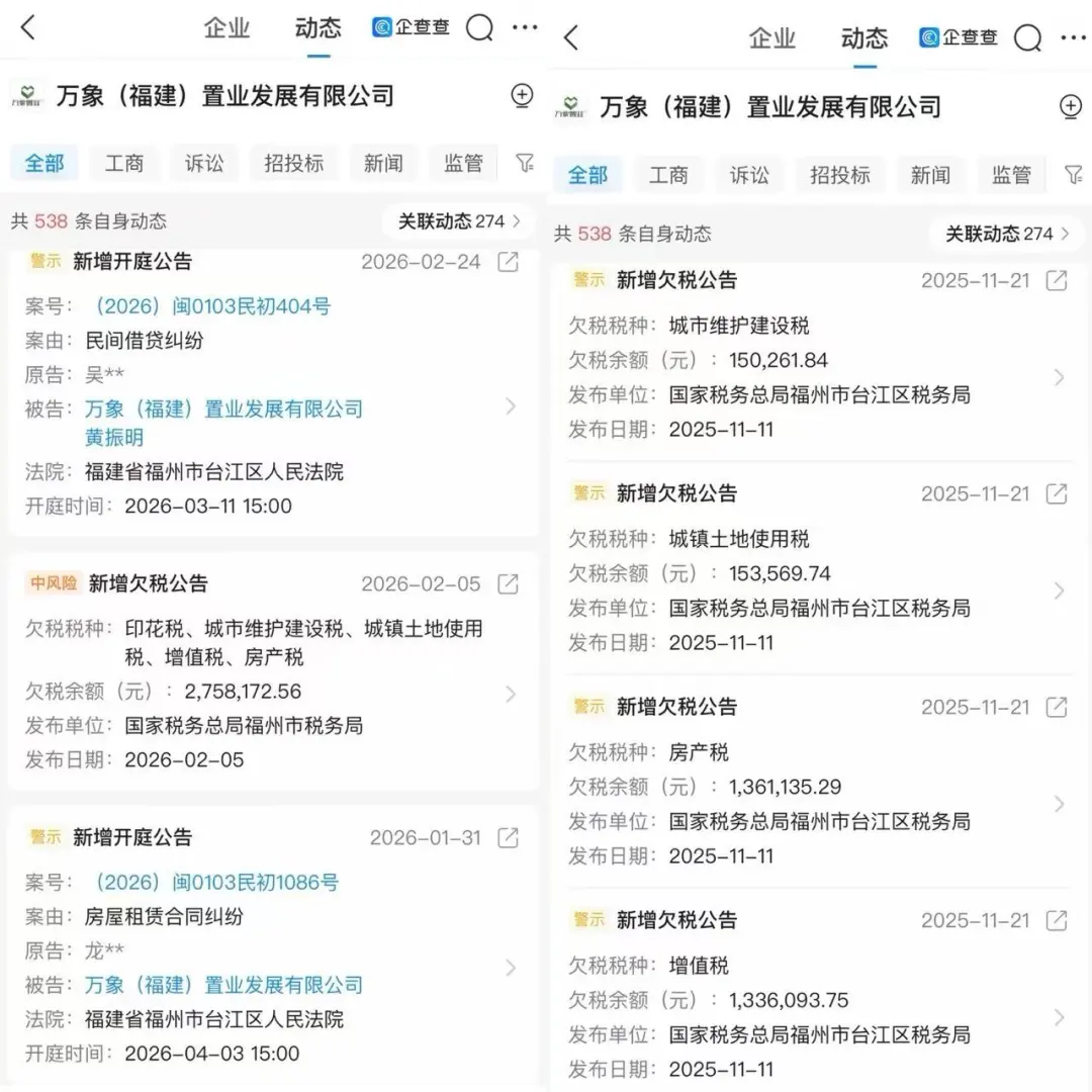万象九宜城的认证主体为万象(福建)置业发展有限公司。企查查显示,仅最近半年,这家公司就新增5则欠税公告,欠税税种包括有印花税、城市维护建设税、城镇土地使用税、增值税、房产税等,合计欠税余额近600万元。
