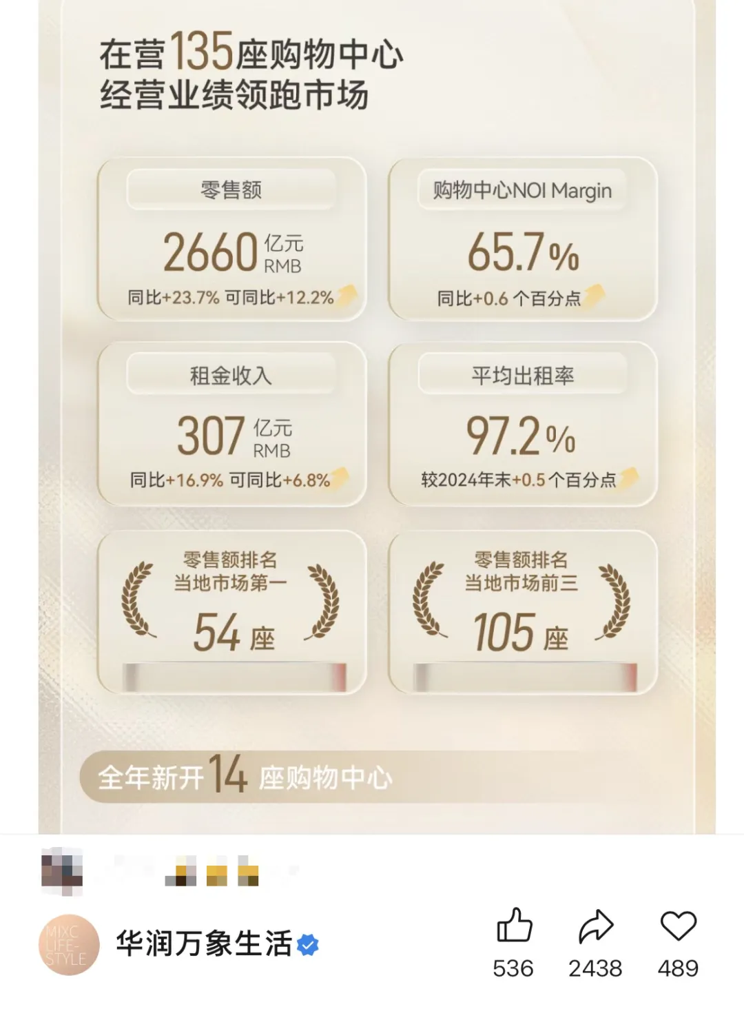 根据华润万象生活(01209.HK)新近披露的财报:截至2025年末,华润万象生活在营购物中心数量从一年前的118座增至135座,在管建筑面积同步扩大至逾1489万平方米。与之对应,华润万象生活目前在管的135个购物中心,去年实现零售额2660亿元,同比增长23.7%。