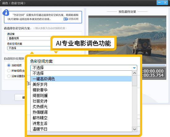 导入视频后,点击主界面左下角“AI电影专业调色”,弹出的设置窗口里有超多调色方案: