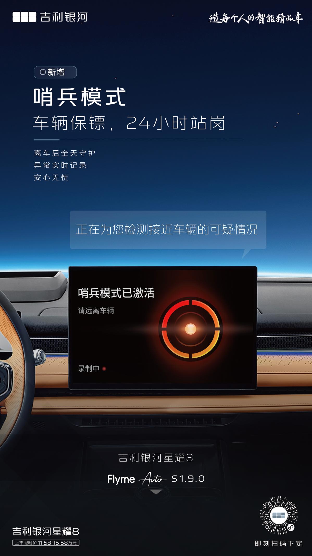 在首次大版本OTA升级中,星耀8的安全守护实现了从“行驶中”到“驻车后”的全场景覆盖。新增的 “哨兵模式” 功能,在车辆锁止后,通过环视摄像头和震动传感器,7*24小时监控车辆周边。当检测到可疑人员接近或车辆发生异常震动时,会立即闪烁双闪警示并录制视频证据保存至U盘。用户可通过车机或手机APP查看记录,有效解决了在公共停车场等陌生环境下的车辆安全焦虑,为用户的财产安全再添一把“数字锁”。从物理结构的坚不可摧,到智能系统的未卜先知,再到数字哨兵的全天候警戒,星耀8以其“银河式安全”理念,为用户构建了一个移动的、让人彻底安心的安全堡垒。