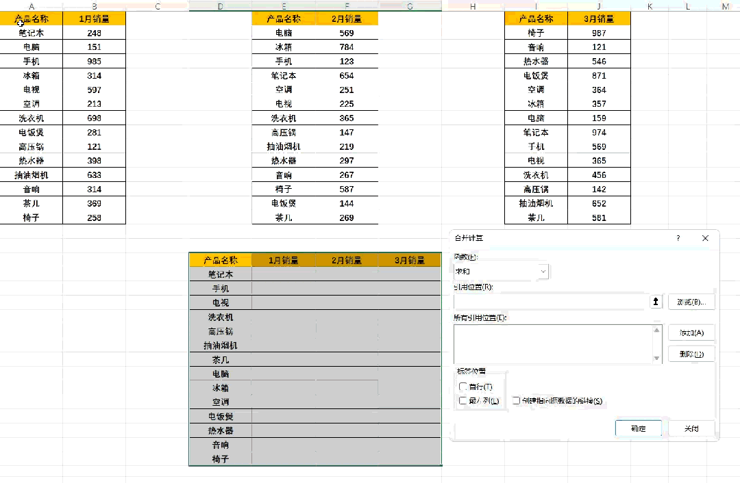 其实在excel中专门有一个解决多个表格数据合并的神器-合并计算,它不需要你记任何公式,也不需要你有VBA方面的技能,就可以将多表格中的产品数据合并在一起,就算是排序错乱也能对号入座!