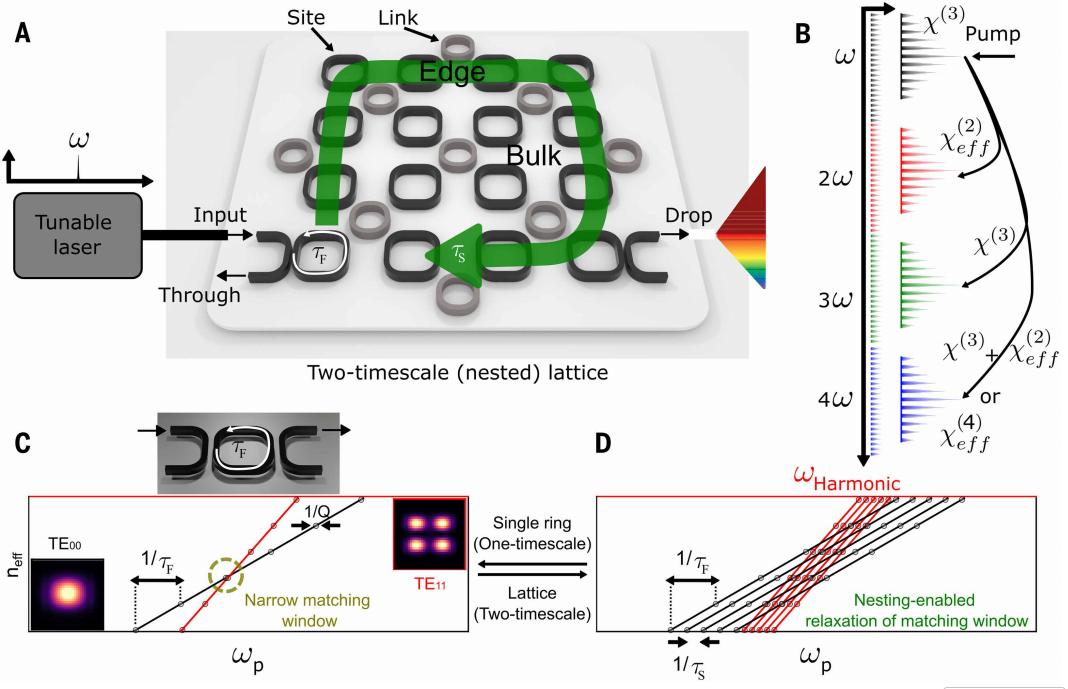 这个巧妙的结构形成了密集的光学模式网络,让红外光可以同时高效转化为二次、三次甚至四次谐波,在芯片上被动生成从红外到蓝紫的绚丽光谱。