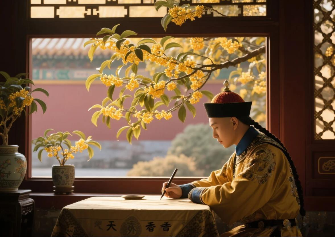 这是乾隆皇帝的诗作。他喜欢桂花,宫廷和边塞的行宫,都种植有桂花树。只是花期不一。
