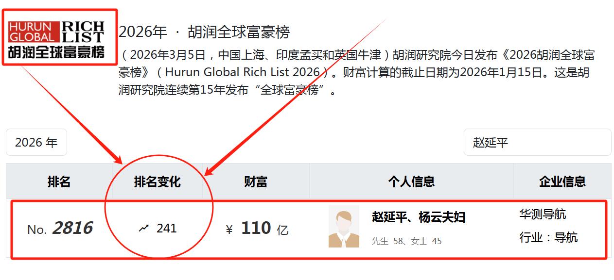 近日,胡润研究院更新的《2026胡润全球富豪榜》显示。赵延平、杨云夫妇,身家110亿人民币,排名跃升了241位。