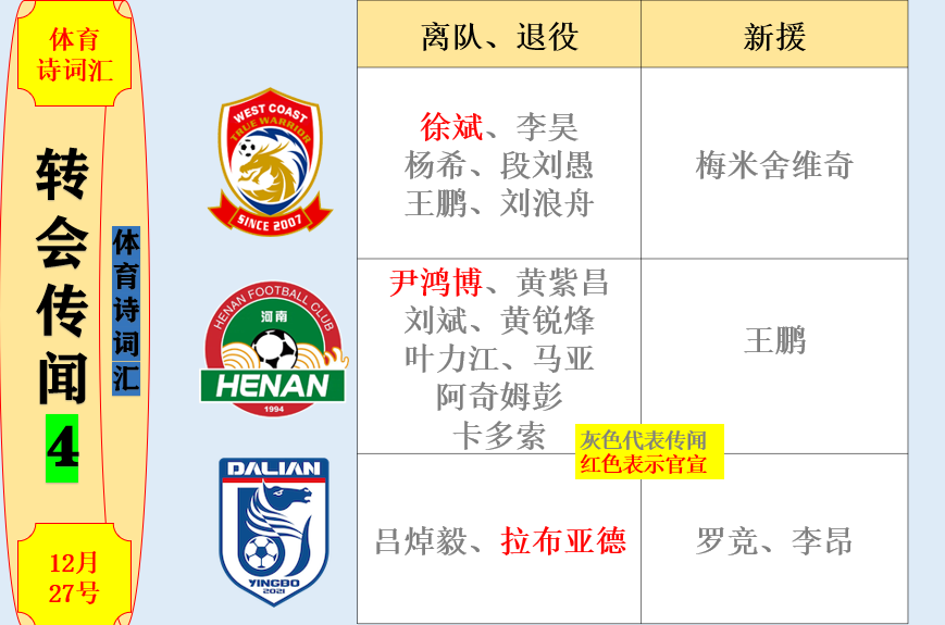 新年即将到来,各队新帅选择进入倒计时,接下来将是各队新援引进的高峰时间段,前两期汇总了中超前八名的转会传闻,本期统计第9-11名的三支队伍。西海岸继续本土小将的策略;河南目标更上一层楼,大连力争中游。