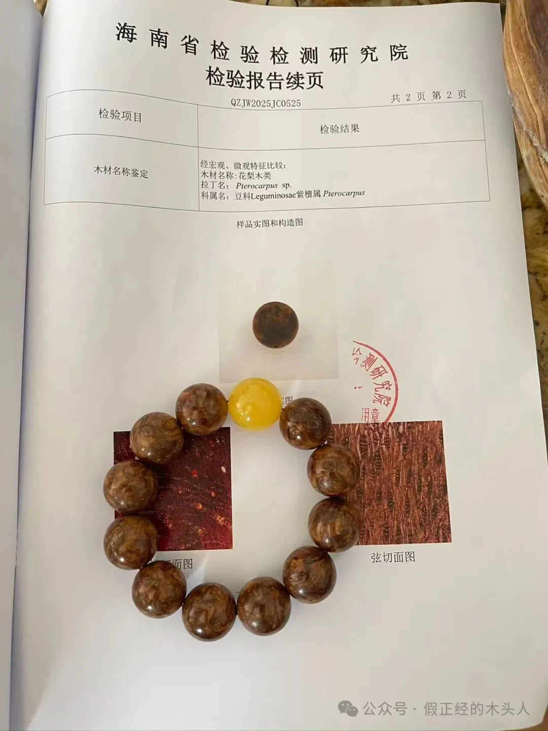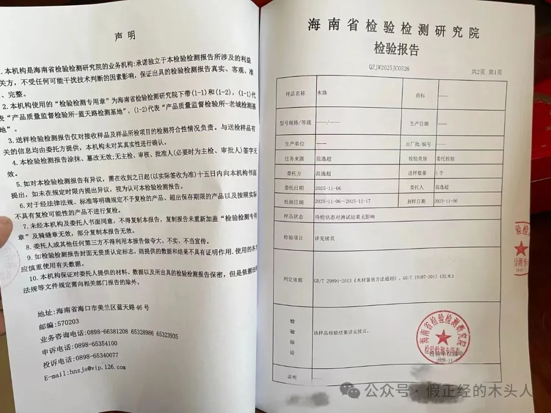 检测报告结论为【豆科—紫檀属—花梨木类】,证实笔者判断无误,而后将报告及材料寄还客户,客户持专业检测报告追讨损失。