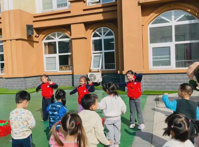 在活力的操场上,大班的哥哥姐姐们化身成了可靠的“小家长”。他们不仅稳稳地帮弟弟妹妹搬运游戏器械,更会弯下腰,牵起那双小小的手,轻声说:“来,我们一起把沙锤拿好。”当欢快的音乐响起,他们站在队伍前列精神抖擞地带操,还不忘回头给弟弟妹妹一个鼓励的微笑。