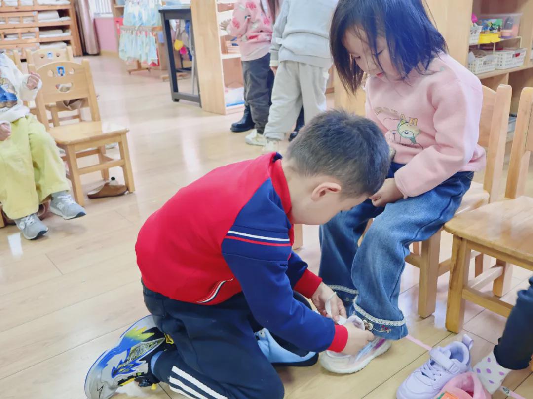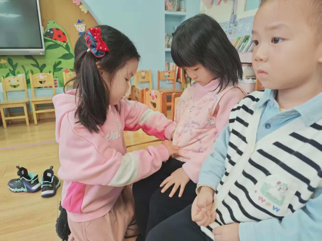 午睡时光里,大班的哥哥姐姐们化身耐心的小老师。“小标签是后面,大风车转呀转,衣服就穿好咯!”伴着童谣,他们耐心示范,帮弟弟妹妹解扣子、叠衣服、摆鞋子,再用温柔的睡前故事陪伴入梦。离园时分,关爱在延续。他们细心帮弟弟妹妹擦净小脸,穿好外套,扣好扣子,嘴里还念着“小兔子过山洞”的穿鞋口诀。从清晨到日暮,这份日复一日的守护,让幼儿园的每一天都始于爱,归于温暖。