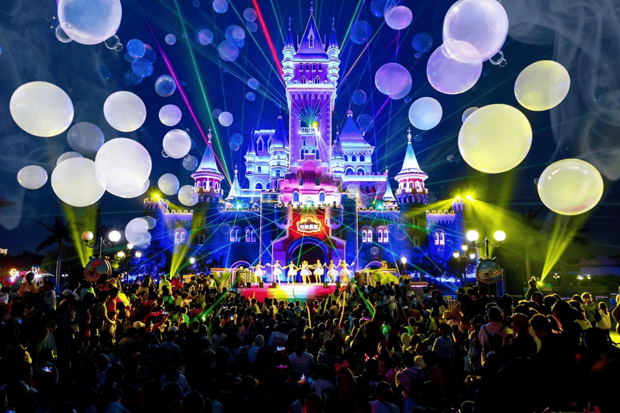 当夜幕降临,备受期待的星空泡泡秀将迎来园区首次亮相。漫天飞舞的彩色泡泡在光影变幻中交织出酷炫与浪漫并存的视觉奇观,为现场增添迷幻动感的潮流氛围。与此同时,万人音浪盛典将在主舞台震撼开启,动感电音与璀璨光影交织,带领全场观众一同沉浸在音乐的海洋中。音乐与光影共振,泡泡与笑声齐飞,两大环节交相辉映,共同打造电音节期间不可错过的夜场高光时刻。