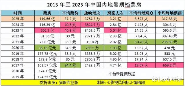 据《影视风向标》编辑部核算,今年暑期档平均每场电影观众8.527人,平均每场票房317.88元,这两项数据仅高于2024年、2022年和2021年暑期档,与2017年巅峰时期的19.57人和669.2元有很大差距。