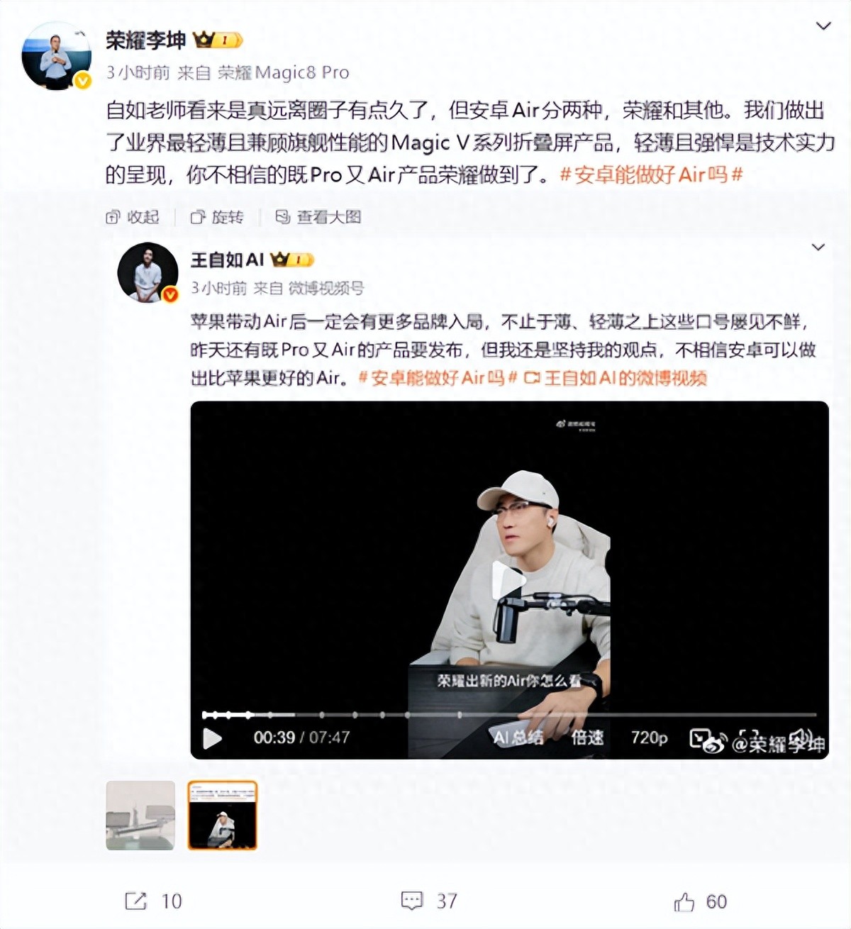 然而,这番论调显然刺痛了安卓厂商的神经。荣耀李坤的回应堪称“火药味”十足,他不仅否定了王自如的“过时论”,更抛出了一个极具霸气的定义:“安卓Air分两种,荣耀和其他。”
