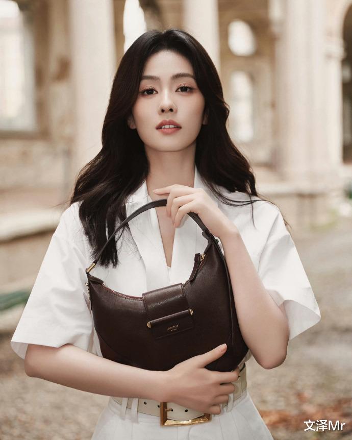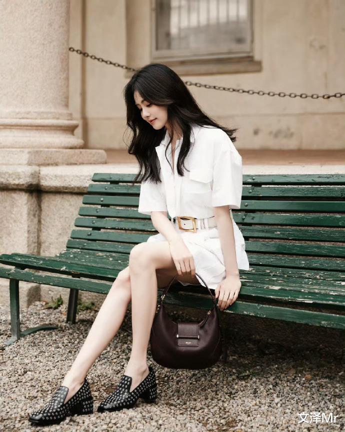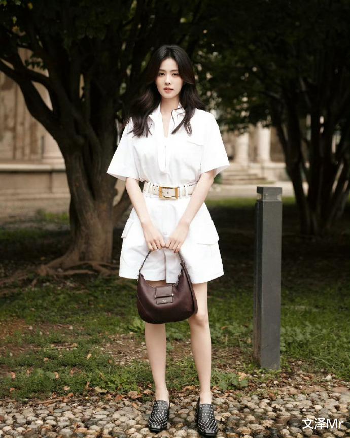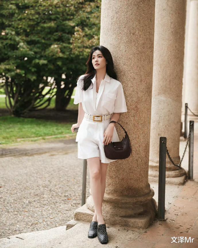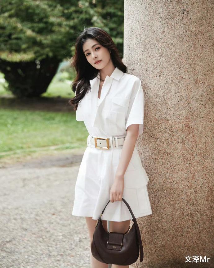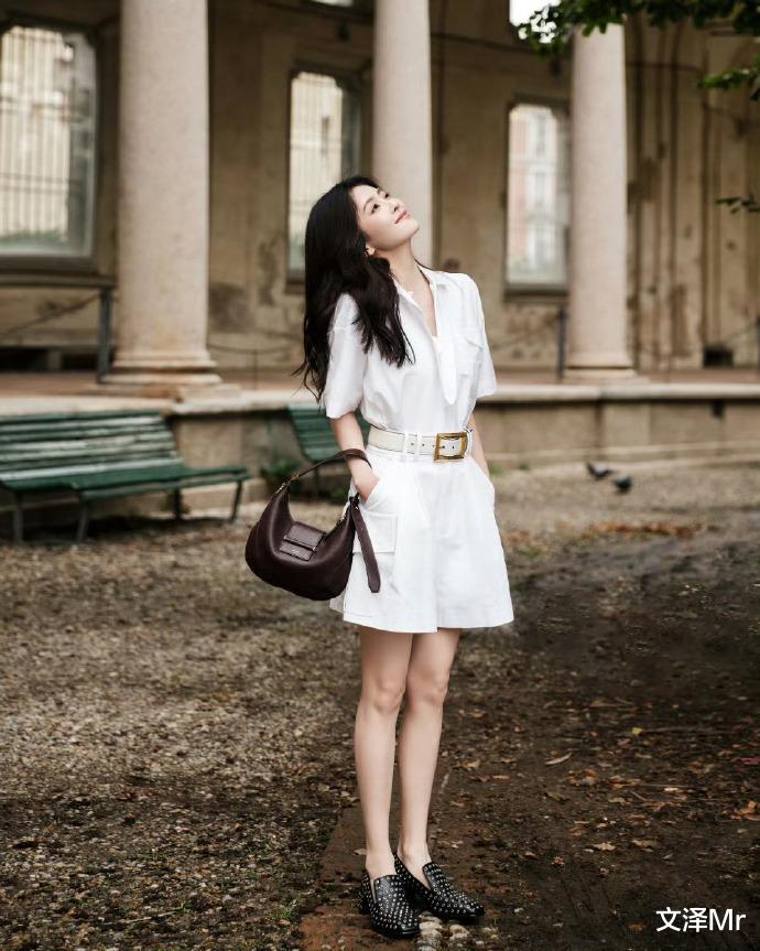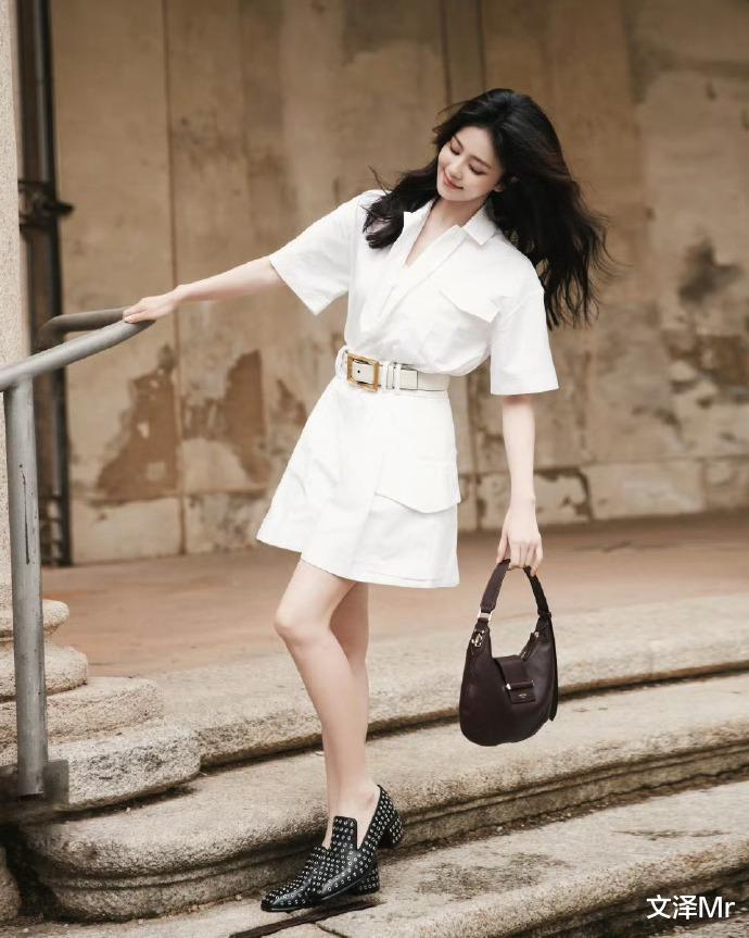 斑驳的暖色调石墙前,白鹿一袭白色短袖连衣裙迎风而立。腰间金色方扣腰带巧妙勾勒曼妙曲线,深紫色手提包与黑色铆钉鞋的碰撞恰到好处。她轻扶栏杆回眸的瞬间,仿佛从复古电影走出的女主角,用极简配色演绎出高级时尚感。