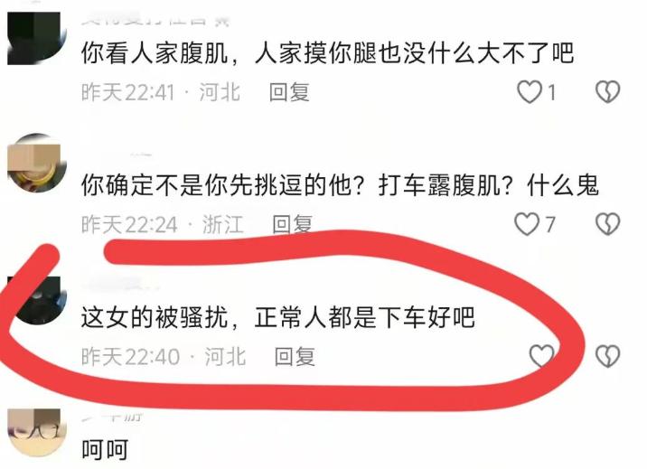 长得这么好看,难怪司机忍不住。是不是穿得太暴露了,才让人有了非分之想?司机露出腹肌的时候你还笑,那你是不是也觉得挺好的?遇到这样的事情正常人应该直接跑掉,你嘻嘻哈哈算怎么回事?看到这些评论的时候,我愣住了。