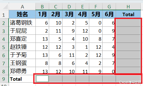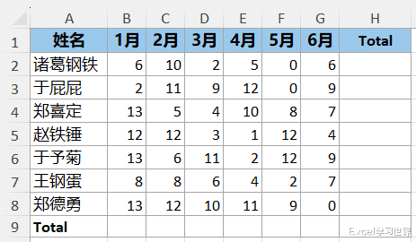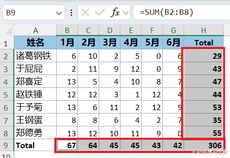 此处的公式就表示对 B2:G8 区域逐行求和。