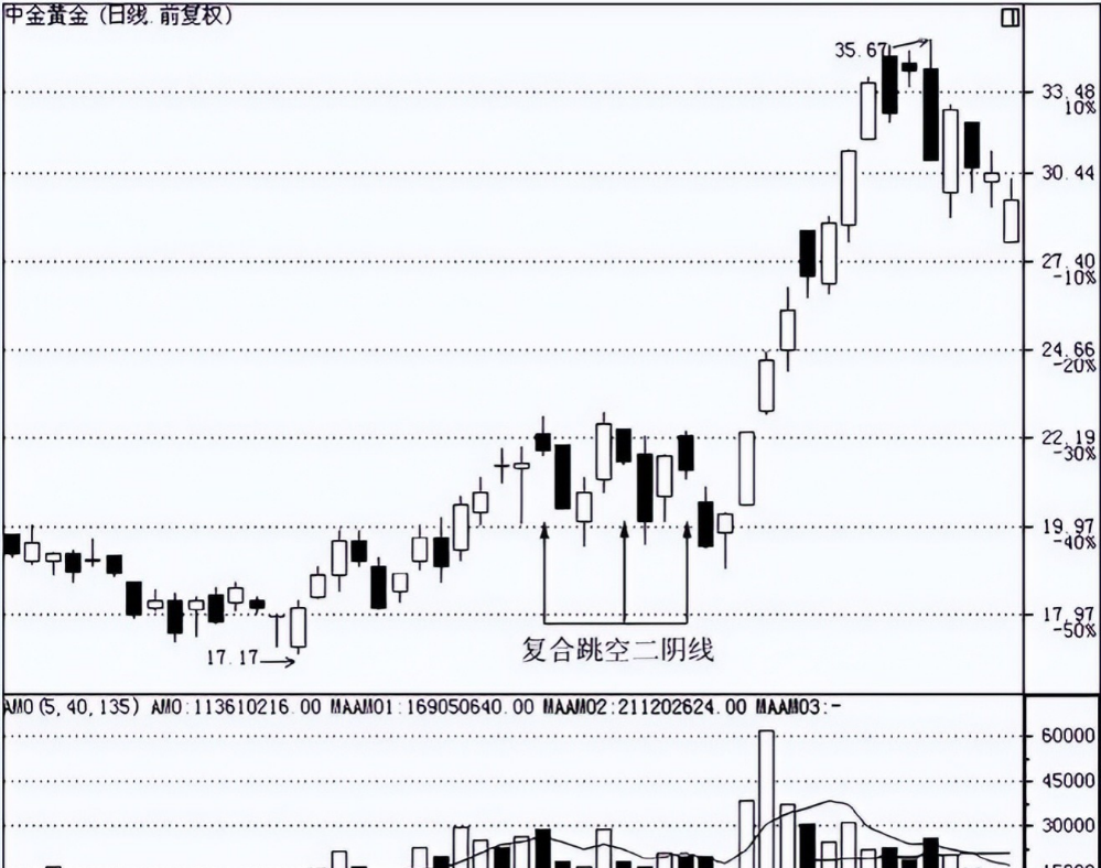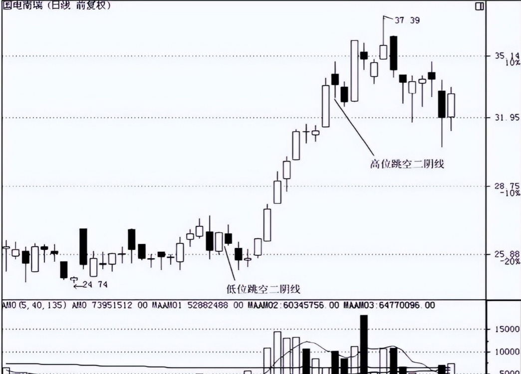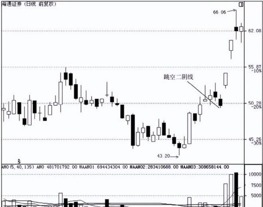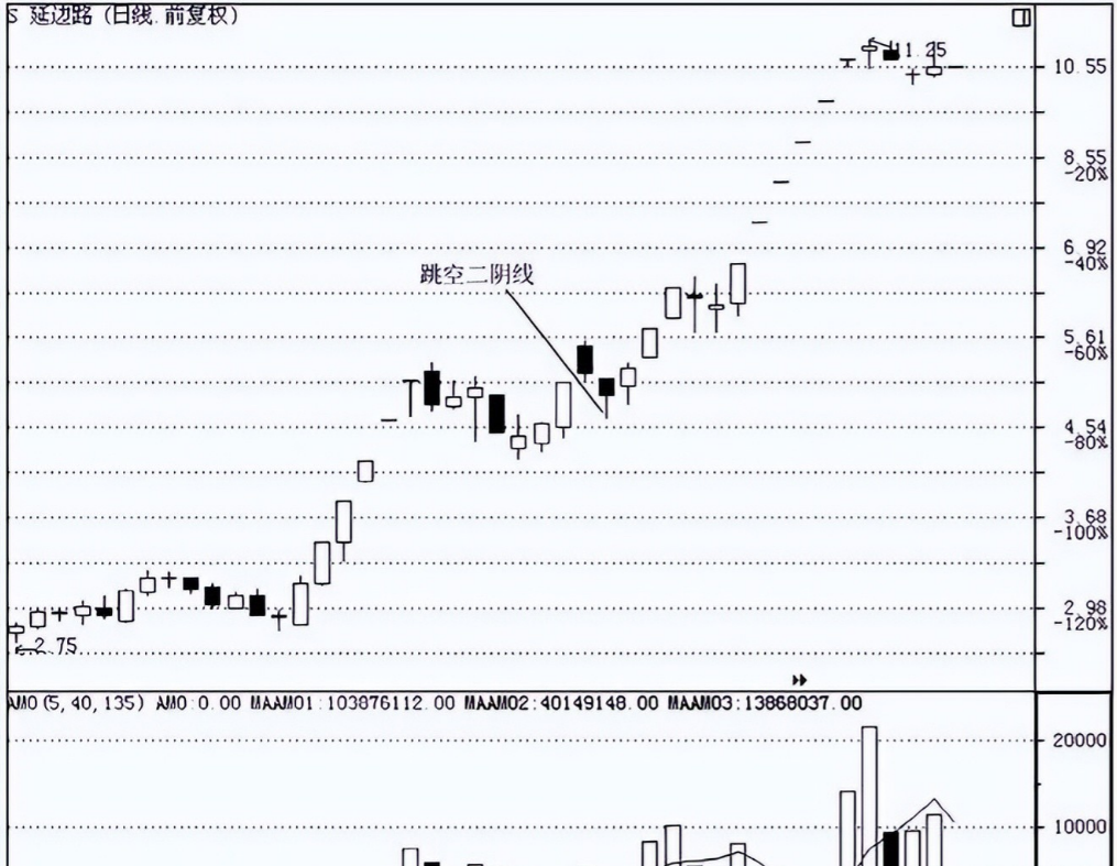 一旦股价出现"跳空双阴",就是主力洗盘完毕的标志,股价即将暴涨