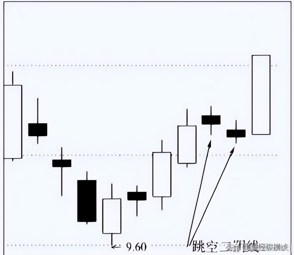 若第三天跳空高开越过跳空二阴线,股价将会连续涨停。