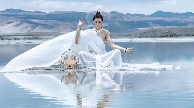 盘膝坐于澄澈如镜的湖畔,额间一抹红色宛如点睛之笔,整个人散发着神秘的神圣气息,尽管是男性扮相,但他却将菩萨的慈悲与庄严演绎得淋漓尽致,让人感到叹为观止。