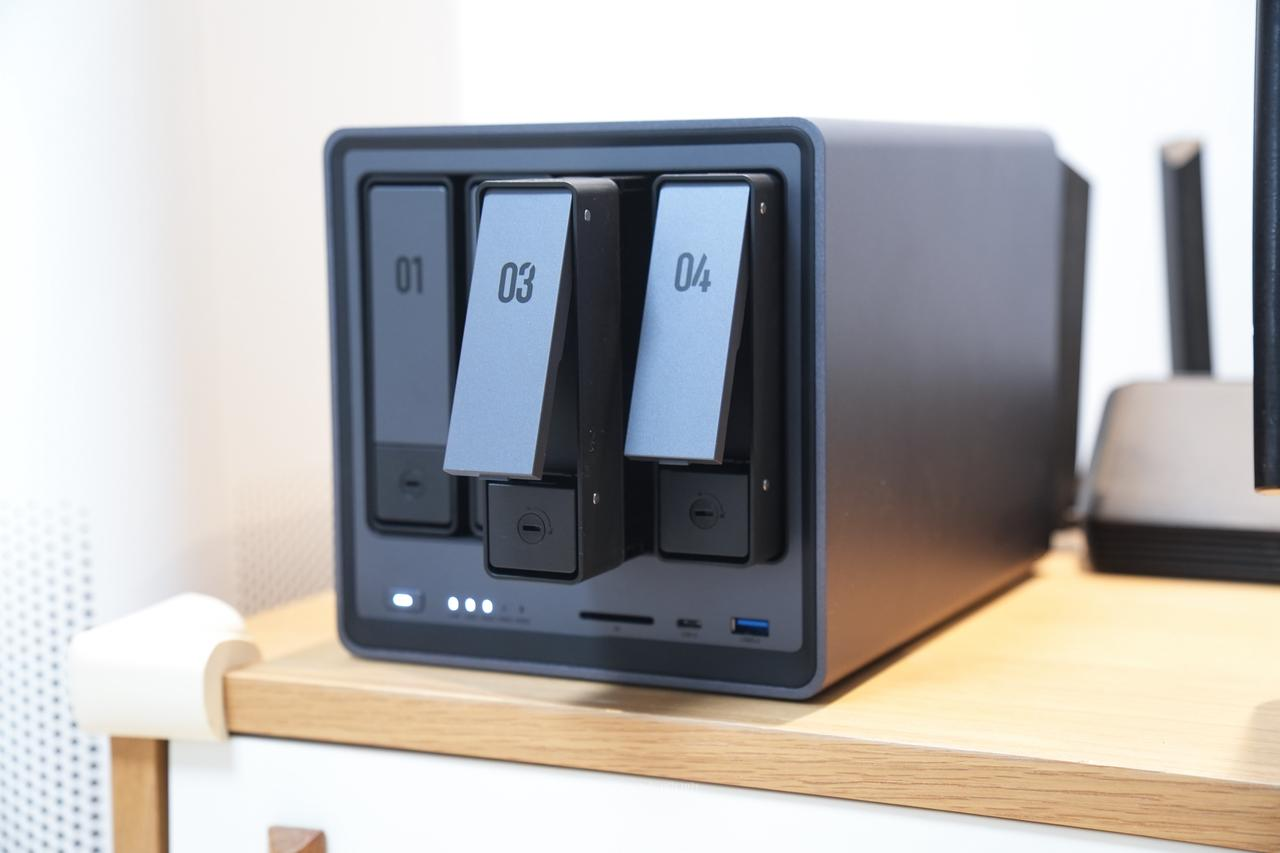 绿联DXP4800这个硬盘盒的设计特别人性化!它四个硬盘位都是独立模块化的,最厉害的是有个"一键弹出"的小机关——轻轻按一下底部,弹簧卡扣就会自动弹开,隐藏的提手也跟着冒出来。这时候你只要横向一拉,整个硬盘位就轻松取下来了,4盘位布局科学,单盘位最大支持24T,这也使得整机最大可扩展至112T(含2个M.2插槽)。